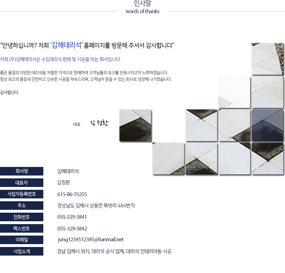 상호명 : 김해대리석 | 대표자 : 김정환 | TEL : 055-329-5841 | FAX : 055-329-5842 | ADD : 경상남도 김해시 상동면 묵방리 484번지 | 사업자등록번호 : 615-86-15255